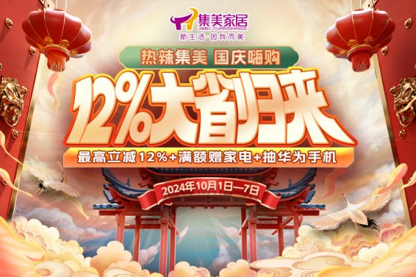 随着金秋十月悄然临近,国庆佳节即将拉开帷幕。在这个收获与欢聚的季节里,集美家居大红门商场与定慧桥商场,精心筹备了一场嗨购盛宴——“热辣集美,国庆嗨购”,旨在为广大消费者带来一场集购物、娱乐、抽奖于一体的消费狂欢。本次活动不仅优惠力度空前,更准备了包括华为手机在内的海量精美礼品,让每一位踏入集美家居的顾客都能满载而归,欢度国庆佳节。