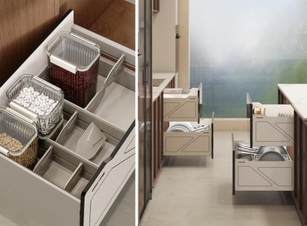 新系列还推出27种收纳模块,自由选配,多元组合,用户可以配置属于自己的收纳空间,完美解决厨房杂乱和拥挤的头等难题。不再担心物品无处放、收纳空间浪费等问题。第四代魔法抽系列在外观设计上也首次采用了浅调的奶咖色系,简洁明朗,侧帮图案由∞符号相连和叠加形成,蕴含收纳无限的理念,黑色几何线条加以勾勒点缀,视觉上柔和轻盈,光影变幻折射都是细节的精致与质感。远看,不抢眼、不打扰,将家居审美发挥的自由交给用户,适配各种厨居设计风格。近用,每一处细节设计都精心考究,是艺术与生活的有度结合、完美平衡。
