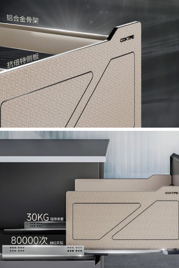 第四代魔法抽系列历时550多天,匠心研发、精心打磨,整体品质在精进!选用6系铝合金铸就框体骨架,具有良好的强度和耐腐蚀性,触手温润,质感十足;侧板是抗倍特材质,耐候性能极佳,防潮耐磨易清洁。采用德国海蒂诗V6 YOU进口导轨,开合静音,80000次以上顺畅推拉,30kg强悍承重。底部防滑垫则是全新菱形纹样设计,克服了市面上常见的易起翘的缺陷,采用PEVA材质,更加抗菌防水。吊柜系列主打产品云狐外观独具特色,以流畅的弧形线条勾勒立体空间,人体工学把手设计,抓握更具舒适感。推拉之间,铁质连臂稳定承重,高处物品轻松拿取。云梯植入智能系统,全底面任意点触控升降,红外感应,遇阻悬停,取物便捷更加安全。高柜系列多层大空间,集中收纳更有序。甄选材质与匠心工艺的极致融合,彰显酷太自我革新的底色。