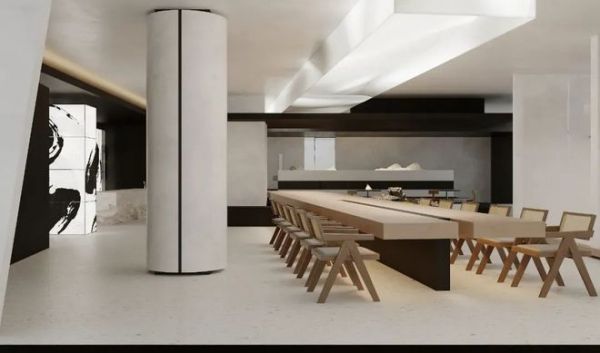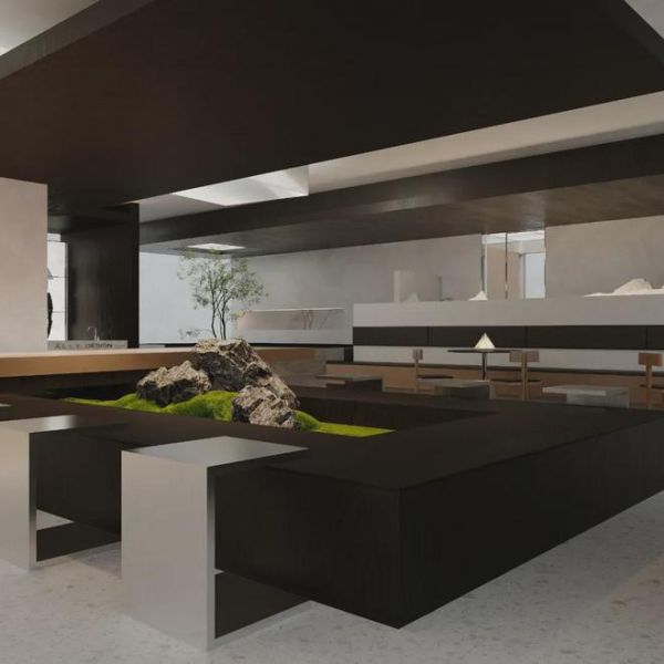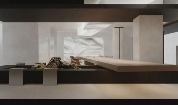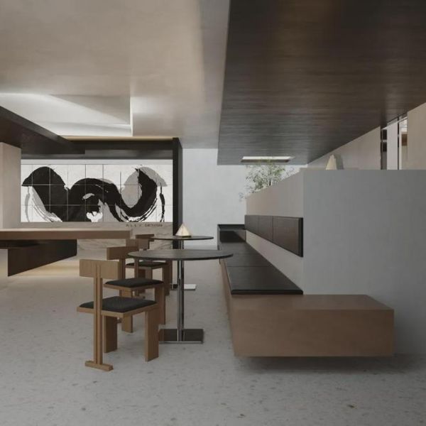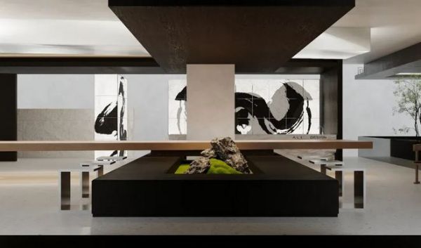 悬挑的会议长桌和景观穿插,几何的块体与线条相结合,将整个空间塑造得立体丰富;黑白与木色交织,以简洁凝练的形式彰显空间的商务气息。水墨的装饰笔走龙蛇,将空间的洒脱大气展现得淋漓尽致。