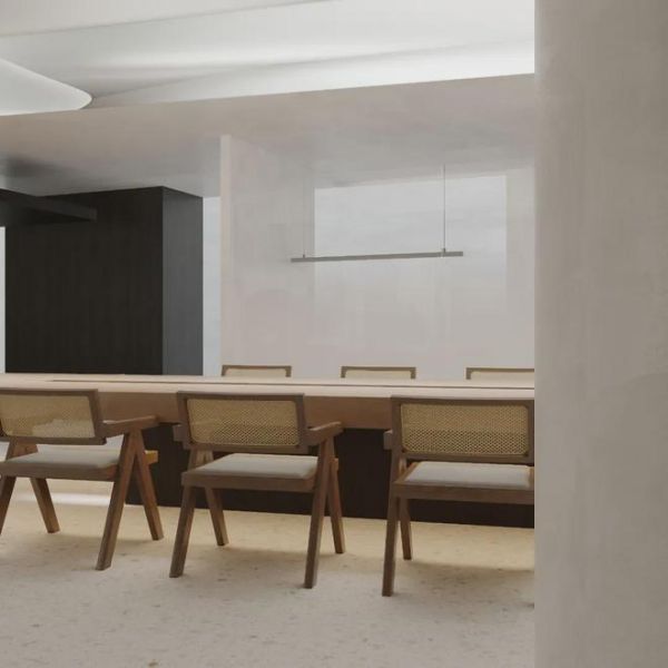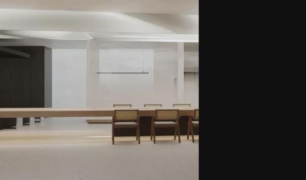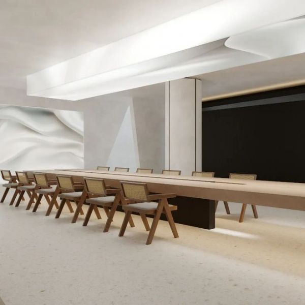 超大的长桌满足会议交流的需求,原木和藤编材质温润自然,将舒适的气息散播在每一处。顶灯设计兼顾实用和美学,让光线均匀地照亮空间,同时柔和的灯光和曲线交相呼应,营造出光线如水般的空灵与动感,唯美动人。