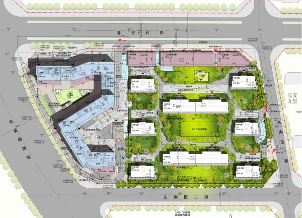 社区规划共8栋7-10层的低密度洋房,总共180套,地块西侧三角形地块为酒店,“之”字型排布,最高25层,楼体最高80米,北侧包含三栋商业楼呈一字型,从西到东,分别是2F、3F和2F。