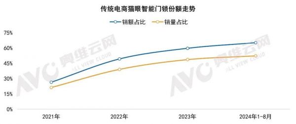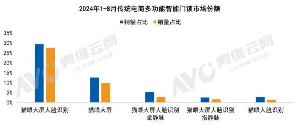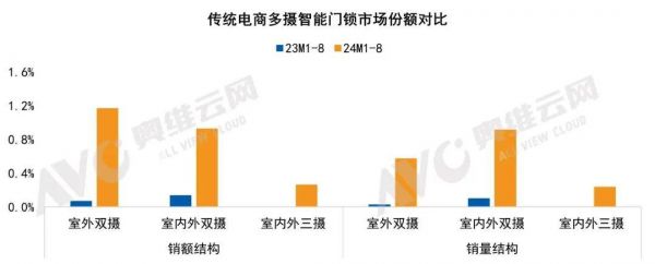 奥维云网(AVC)线上监测数据显示,2024年1-8月传统电商多摄智能门锁市场零售额占比为2.3%,零售量占比为1.7%。室外双摄、室内外双摄、室内外三摄均为增长表现,这不仅展示了智能门锁领域的快速增长,也说明了消费者对于提高生活质量的科技产品的需求不断增强。