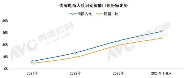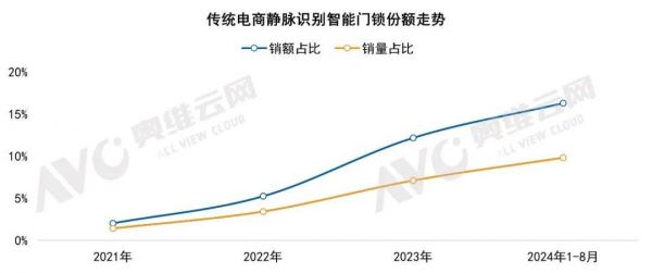 2023年至2024年,静脉识别智能门锁的市场接受度和普及率持续增长。奥维云网(AVC)线上监测数据显示,2024年1-8月传统电商静脉识别智能门锁零售额占比达到16%,零售量占比达到10%。