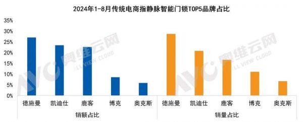 其中,德施曼品牌在高端市场的竞争中优势明显,处于领先地位。奥维云网(AVC)线上监测数据显示,2021年至2024年8月期间,传统电商智能门锁2000元及以上高端市场中,德施曼的零售额占比达到36.8%,零售量占比达到37.5%,稳居第一。