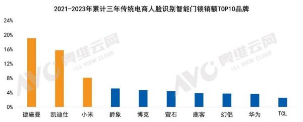 德施曼通过优化人脸识别算法,确保快速准确的识别率,为用户提供了更加便捷和安全的使用体验。凭借其长期积累的技术经验和持续的产品创新,在人脸识别智能门锁市场上占据领先地位。奥维云网(AVC)线上监测数据显示,在2021年至2023年期间,德施曼在传统电商渠道人脸识别智能门锁市场中占据了19%的零售额份额,位居榜首。