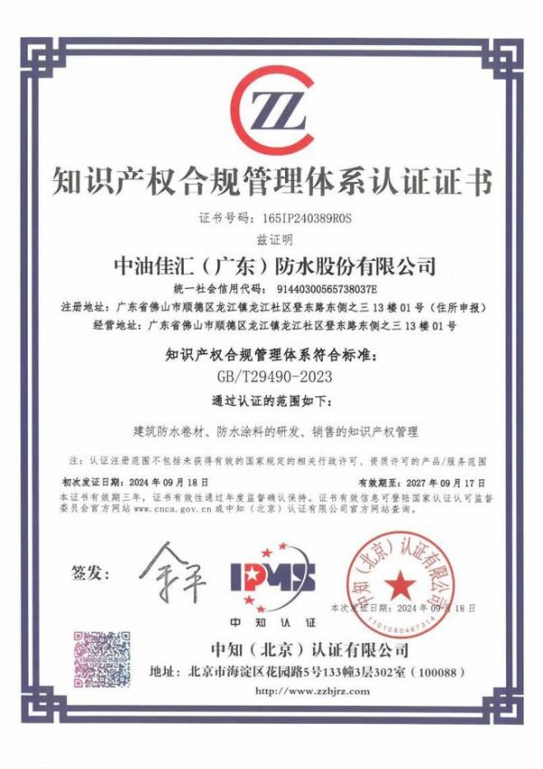 2024年9月,中国联塑旗下中油佳汇(广东)防水股份有限公司通过《企业知识产权合规管理体系要求》(GB/T 29490-2023)认证,标志着联塑和中油佳汇在知识产权管理方面达到了的新的高度。