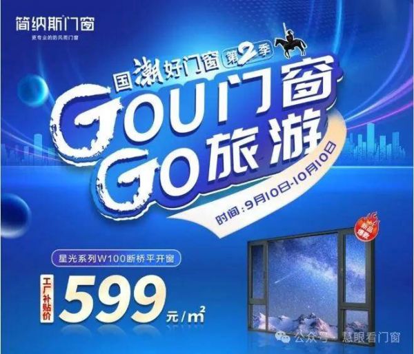 9月10日至10月10日简纳斯门窗推出“GOU门窗 GO旅游”促销活动,其中推出的星光系列W100断桥平开窗价格为599元/㎡。