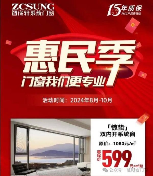 智宬轩门窗在8月-10月举办“惠民季”促销活动,推出“惊蛰”双内开系统窗和“白露”外开系统窗,产品价格均为599元/㎡。
