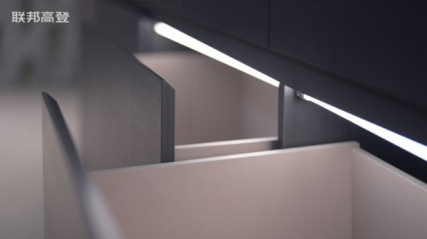 斜切工艺,是指将板材进行斜切处理,以斜边收尾,使得柜体拼接处更加紧密贴合,外观更加精致连贯。这种工艺对切割精度要求严苛,但联邦高登依靠其先进的切割设备和技术,将这一工艺演绎至极致。在联邦高登空间诗学展厅中现代餐厅部分的抽屉柜体上,就特别采用45°斜切工艺,这使得抽屉边缘外观截面更为纤细小巧,线条则显得更为简约流畅,无不透露出精致细腻的高档质感。