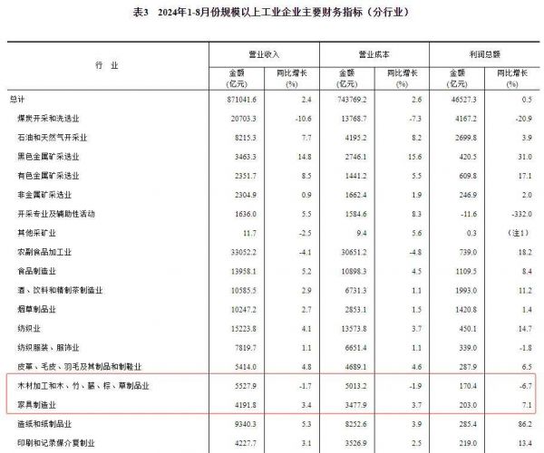 聚焦到家居建材行业,1-8月份,中国家具制造业营业收入为4191.8亿元,同比增长3.4%;营业成本3477.9亿元,同比增长3.7%;利润总额为203亿元,同比增长7.1%;木材加工和木、竹、藤、棕、草制品业营业收入为5527.9亿元,同比下降1.7%;营业成本5013.2亿元,同比下降1.9%;利润总额为170.4亿元,同比下降6.7%。