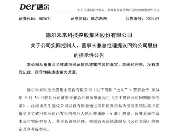 10月8日,德尔未来(002631.SZ)公告称,董事会于2024年9月30日收到公司董事长兼总经理汝继勇先生《关于提议公司回购股份的函》。汝继勇先生提议公司以自有资金通过深圳证券交易所交易系统以集中竞价交易方式回购公司已发行的部分人民币普通股(A 股)股票。回购股份的资金总额:不低于人民币3000万元(含)且不超过人民币6000万元(含)。