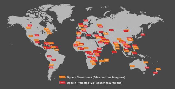 欧派为了更好地服务终端客户,建立起庞大的全球销售网络,在欧洲—英国、法国、葡萄牙,美洲—美国、加拿大、巴拿马,中东—沙特、阿联酋、阿曼、科威特,亚洲—马来西亚、新加坡、菲律宾,澳大利亚、新西兰等60多个国家和区域开设海外零售展厅。
