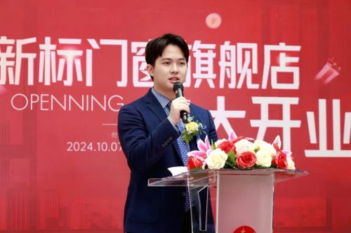 新标门窗广州黄埔旗舰店总经理肖长青致辞,新标门窗广州黄埔旗舰店将会持续努力提升门店服务和管理水平,落实总部举措,让更多家庭都能享受到新标高品质门窗带来的舒适便捷生活,努力打造成经营业绩佳、客户满意度高、市场口碑好的五星标杆门店。