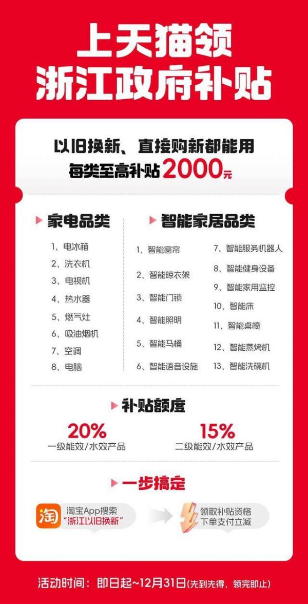 每类补贴2000!浙江在天猫发放家电家居以旧换新政府补贴