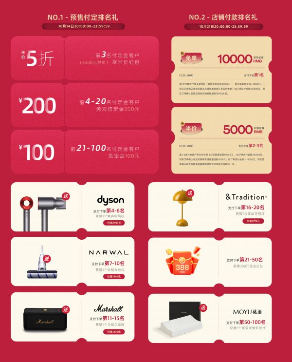 从10月21日20:00至10月24日,实付金额对应不同额度赠送不同豪礼;实付金额排名第一的消费者还将获得价值9999元的莫语高定乳胶床垫。