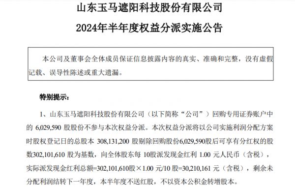 玉马遮阳:2024年上半年预计派发现金红利约3021.02万元