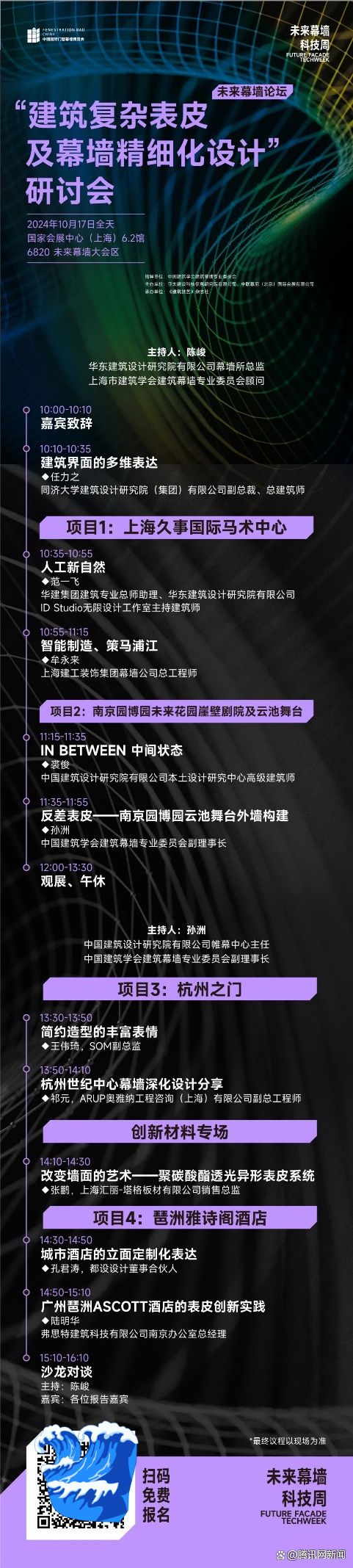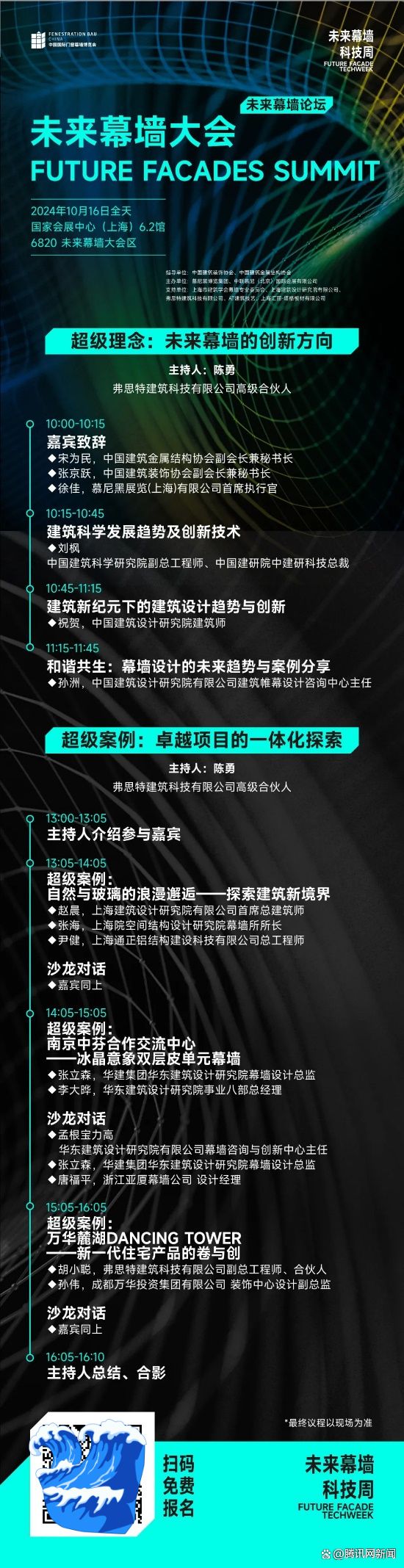 建筑设计×幕墙设计×新材料 Facade Lab 20——幕墙20问×地表最强样板展示,不止最强!由设计延展的产业链条,在这里形成有机共生。今年幕墙科技周联手16位国际知名建筑事务所的中国区主理人及总监,于10月16-17日在展会现场用20个痛点问题点亮幕墙材料新解法。同时,地表最强样板展示将贯穿全展期,让创新持续滚烫!