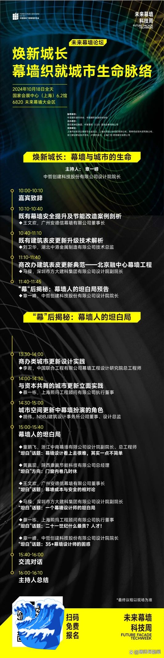未来幕墙科技大会及论坛——专讲超级案例!10月16-18日在国家会展中心6.2馆,建筑及幕墙设计、工程、材料专家两两相乘垂直研讨。三天三场幕墙大会及论坛聚焦超级理念与超级案例(10.16)、建筑复杂表皮及幕墙精细化设计(10.17)、幕墙更新(10.18)、“幕墙人坦白局”敢说敢想及材料与设计强组队的“Facade Lab 20——幕墙20问”。
