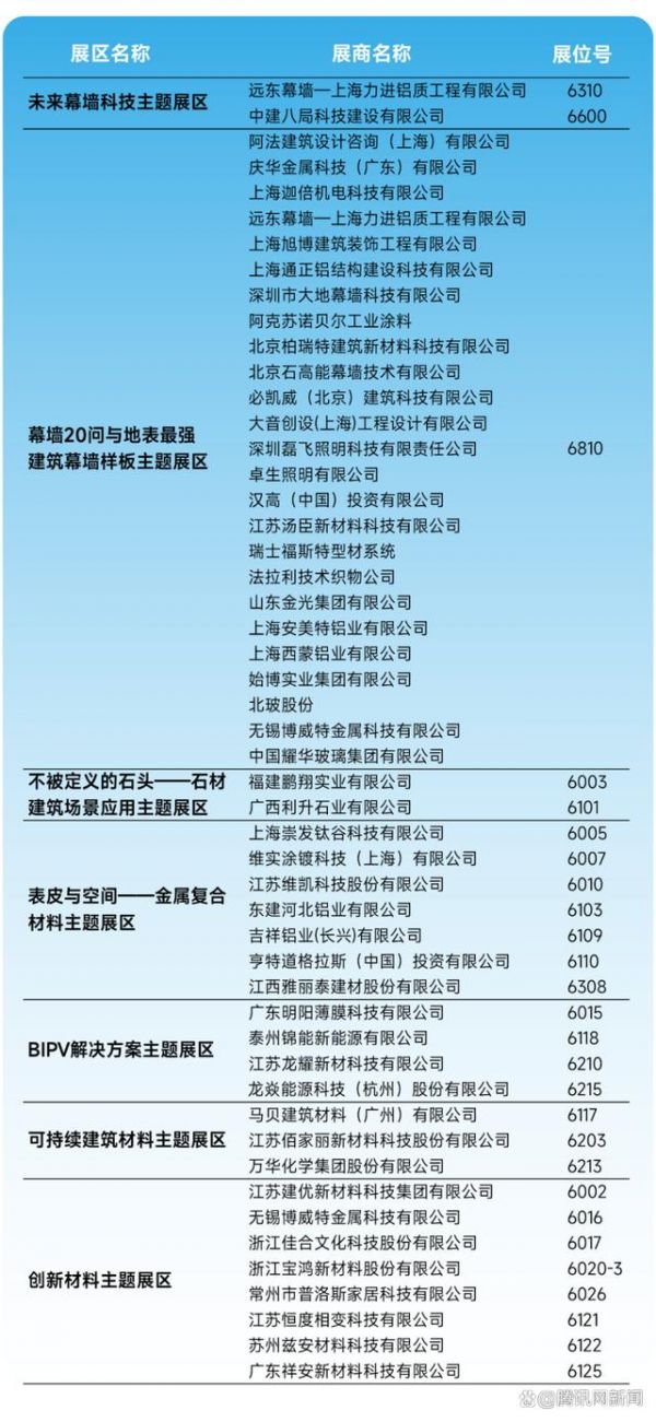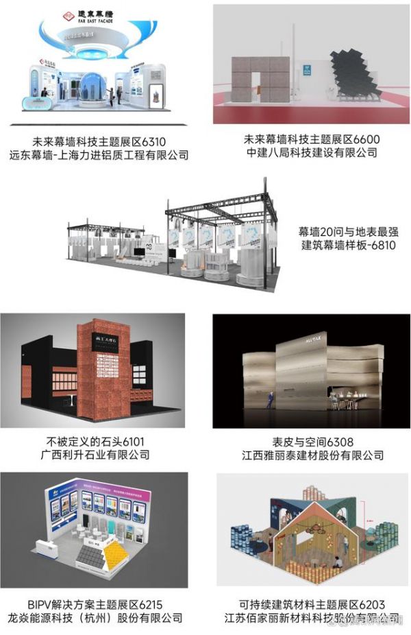 除了地表最强样板展示,6.2馆还遍布六大幕墙材料及工程展区,多类型材料交织而成幕墙系统解决方案,包括石材、金属复材、BIPV、可持续及创新型材料。