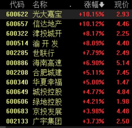 周一早盘,房地产板块开盘走强,截至发稿,光大嘉宝、信达地产涨停,津头城开、渝开发涨超8%。同时,港股房地产股盘初持续走强,截至发稿,旭辉控股集团涨近13%,富力地产涨超10%,中国金茂涨逾7%,万科企业涨超5%。