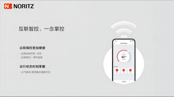 同时,作为数字时代的消费者,对于智能科技的依赖与追求超乎想象,能率 NORITZ也紧跟时代步伐。能率风和系列热水器D5搭载了WIFI远程控制技术,用户只需通过手机APP即可随时随地掌控热水器的状态,无论是提前预热、调节水温还是查看能耗情况,一切尽在指尖掌控,满足以效率为主导的时代。