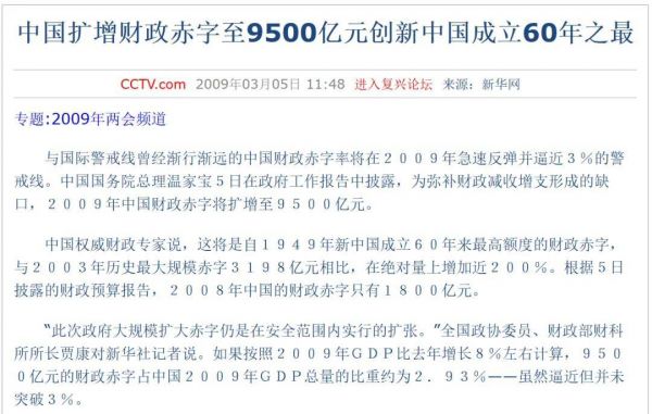 四万亿政策的公布时间是2008年9月份,所以财政赤字在2009年体现,所以2009年我们迎来了新中国成立以来“财政赤字”之最!