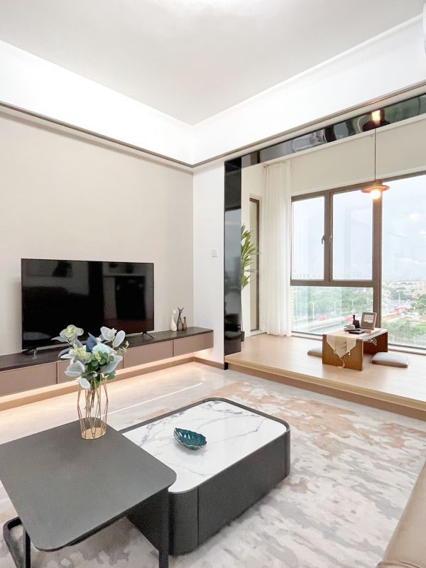 首先,设计师将客厅与阳台之间的隔断打通,让自然光线无阻碍地照射进房间,整个空间瞬间变得明亮通透。封窗加上落地窗的设计,不仅隔绝了外界的喧嚣,更将窗外的美景尽收眼底,无论是晨曦初照还是夕阳西下,都成为家中动人的画卷。