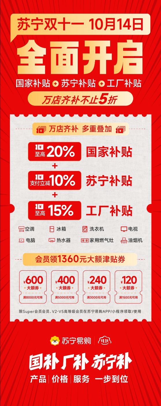 10月14日,苏宁易购聚焦“万店齐补,不止5折”,正式开启“11.11全民嘉年华”大促。苏宁易购持续加码以旧换新活动,在全面承接政府以旧换新20%补贴的基础上,联合工厂品牌加大资源投入,整体优惠低至5折。双11期间,苏宁易购联合海尔、美的、海信、松下、老板等百大品牌全面推出超10000款新品,加大产品供给。同时,苏宁推出“买家电送清洗、直播百万红包、1360元大额津贴”等优惠,为消费者带来更大补贴力度、更简单购买流程、更多新质家电,打造“一站式家电换新”的首选平台。