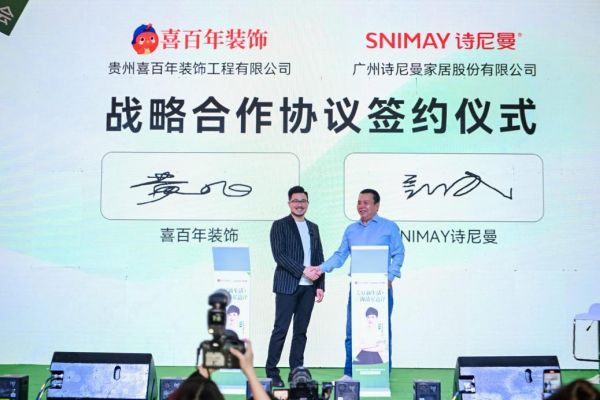 因此在本次活动上,诗尼曼家居与喜百年装饰正式达成战略合作,并在诗尼曼代言人海清的见证下,于喜百年总部新馆举行了战略签约仪式。