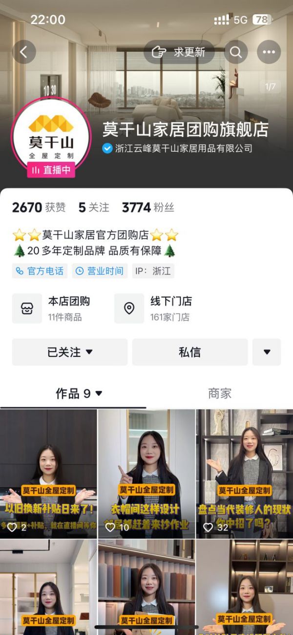 时代的发展,让更多的用户以流量的形式聚集在线上渠道,莫干山全屋定制通过抖音本地生活直播的方式,扩大品牌影响力,提升市场占有率和品牌知名度。“线上买券+线下核销”的服务模式,让更多的客户有机会进店,为终端赋能,让高品质环保产品走进千家万户。