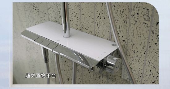 T7花洒拥有350mm超大置物平台,增大56%随手置物面积,随心放置日常洗漱用品,取用方便。