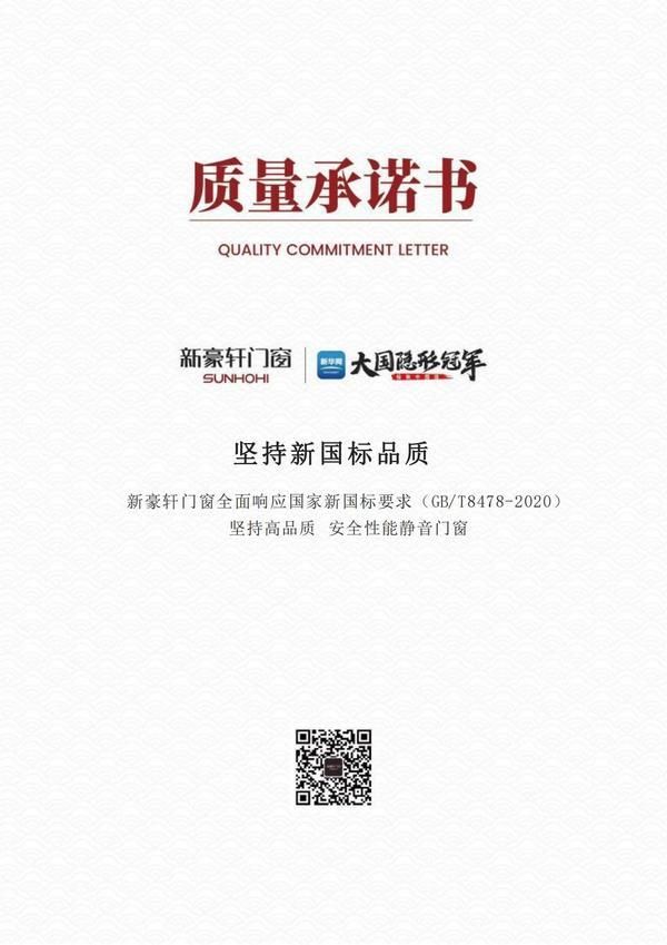 新豪轩门窗《产品质量承诺书》不仅是对消费者购买保障的再升级,更是对门窗行业销售规范的树立。新豪轩以务实、求真、诚信的姿态,让所有购买新豪轩门窗的消费者,所见即所得,所购即所用,在门店看的产品与《质量承诺书》保障的一致,安装到家里的产品与门店下单的一致,全流程消费透明有依据,放心装上品质门窗。