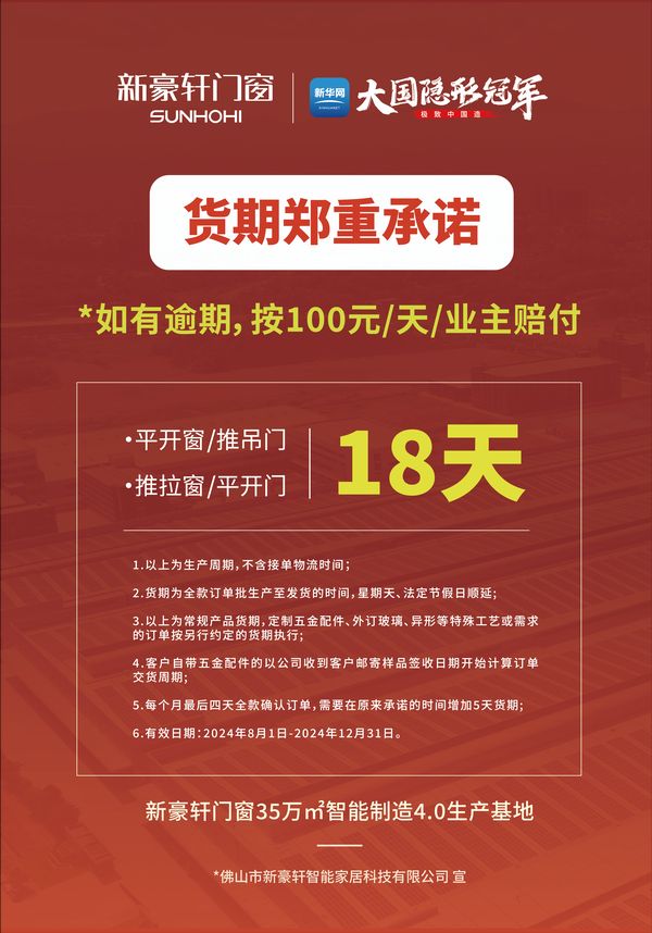 新豪轩门窗依托强大的智能制造水平和产能规模,率先推出门窗产品生产货期和逾期赔付双承诺,总部承诺系统门窗产品(平开窗、推拉窗、推吊门、平开门)从工厂下单到生产完毕入仓仅需18天,大大提高了整体生产交付效率,比行业平均时长缩短了28%,以最快的速度将优质的门窗产品交付到每位消费者家中。并且承诺如有逾期,新豪轩门窗总部将按照100元/天赔付业主。生产货期和赔付的双承诺,代表了我们对交付质效的信心,更是作为冠军品牌对用户的负责和担当。