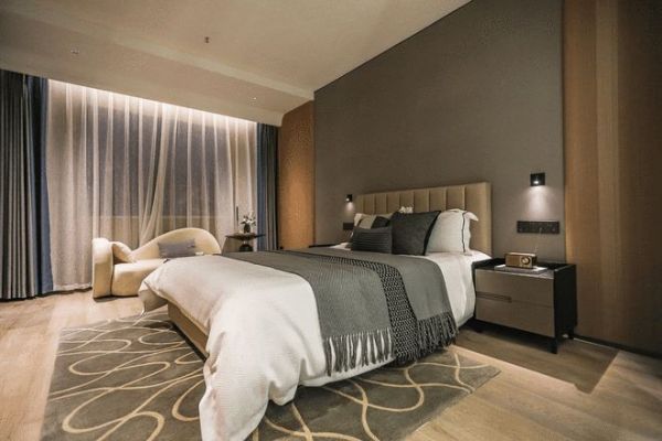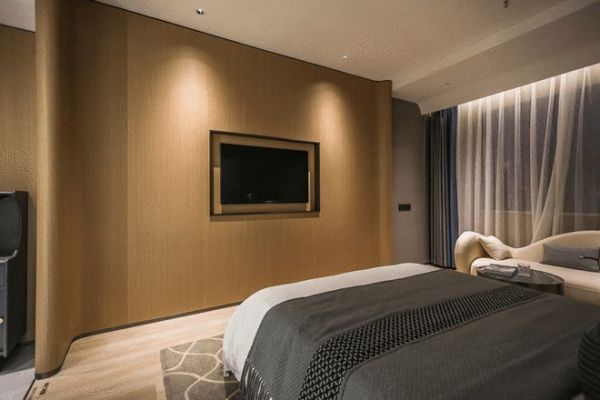 此外,华耐智装酒店样板间所采用的饰面板折弯技术在实现这些弧度处理时,充分考虑了材料的特性与工艺的精准度,确保了弧度板的质量与稳定性,使其既能够完美呈现出设计所需的弧度造型,又能在长期使用过程中保持良好的状态,不会出现变形、开裂等质量问题。