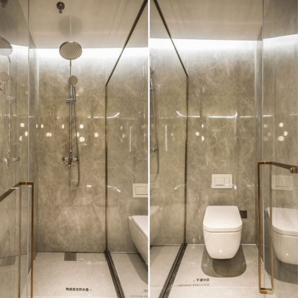 整体卫浴区域采用一体陶瓷复合防水底盘,具备良好的防水性能,用玻璃做了干湿分区处理,有效地阻止湿区的水流渗透到干区,确保干区始终保持干爽整洁,避免了因水渍蔓延而可能导致的地面湿滑等安全隐患,为住户提供了更加安全舒适的环境。在视觉上形成一种自然的过渡效果,使整个卫浴空间看起来更加和谐统一。