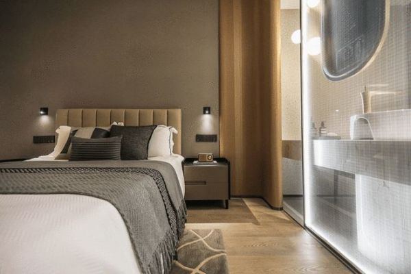 酒店客房的墙面饰面是营造整体氛围和提升住户体验的关键模块,随着材料技术的不断发展,饰面板折弯技术逐渐崭露头角,为酒店墙面装饰带来了新的选择和可能性。华耐智装酒店样板间采用饰面板的弧度处理,在每个界面交接的位置采用弧度板,相较于传统的直角交接墙面,带有弧度的设计使得空间看起来更加开阔、通透,让住户在有限的客房空间内感受到更为宽敞舒适的居住体验。