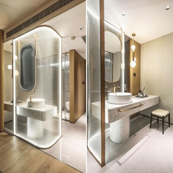 样板间采用幻彩珐琅系列整体卫浴,幻彩珐琅通过表面处理呈现出多种颜色和质感,能够根据酒店的整体装修风格进行定制,使整体卫浴在外观上与酒店环境相协调,营造出美观大方的视觉效果。同时,幻彩珐琅具备金属的强度和耐用性,在频繁的使用过程中能够经受住各种外力冲击和磨损,保证了长期质量稳定。且不易沾染污渍,使得酒店保洁人员在进行日常清洁工作时能够更加高效。