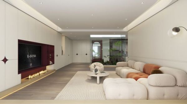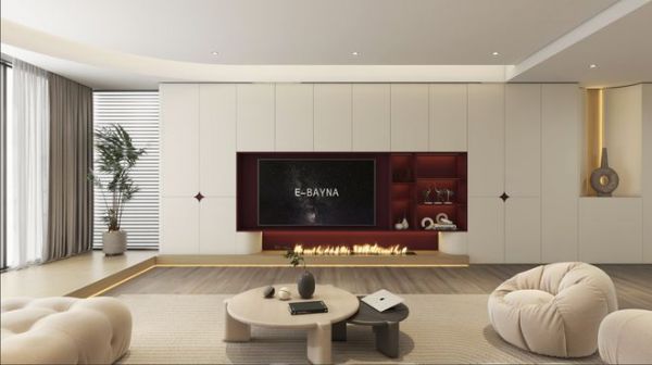 悬空电视柜撞色设计,搭配弧状拼接护墙板,保留奶油风温馨基调又增添几分和谐且富有层次感的视觉效果,让空间轻盈灵动。
