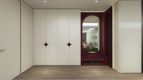 圆弧形的转折处理,使得玄关区域在视觉上更加流畅与连贯,宛如自然延伸出的一个优雅弧度,引领家人顺畅步入家中。下方保留开放式常换鞋区,简洁实用;圆弧拼接门型搭配“白芷”、“红鸾”撞色点缀,打破传统色彩界限,赋予空间柔和而深邃的视觉层次。
