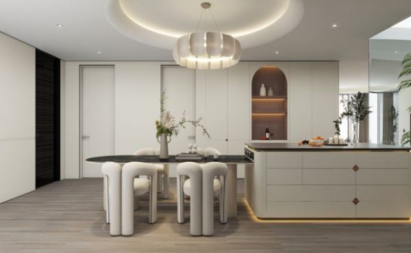 开放式餐厅布局,岛台+餐桌一体化设计,富有造型的餐椅搭配,中和了空间的单一感。简约清爽的“白芷”配色,随处可见的三角几何门型点缀,赋予用餐时光,更多有趣的生活情调,让家人纵享美味佳肴。