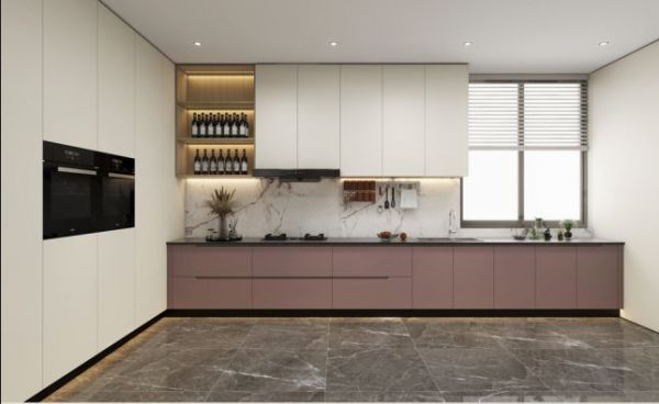 针对厨房潮湿高温的特殊环境,橱柜采用喷粉定制柜,360°环绕防潮覆盖,耐黄不变色,树脂粉末高温固化,色彩更耐看,打造高级温柔的厨房。“藕粉”与“白芷”搭配,温暖柔和的色调,清新唯美的厨房空间,实现功能和美观的统一,让下厨时光变得优雅从容。