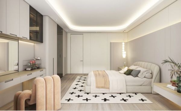 打破传统墙面直线条的常规设计,圆弧护墙板以更柔和的曲线语言,勾勒卧室的柔美与静谧,搭配奶油色系软装,简单耐看,营造深度睡眠的舒适环境。