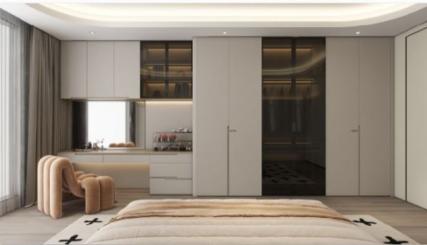 一门到顶衣柜,嵌入式梳妆台一体化设计更省空间,在满足衣物收纳的同时,亦解决日常美妆、办公学习的需求。