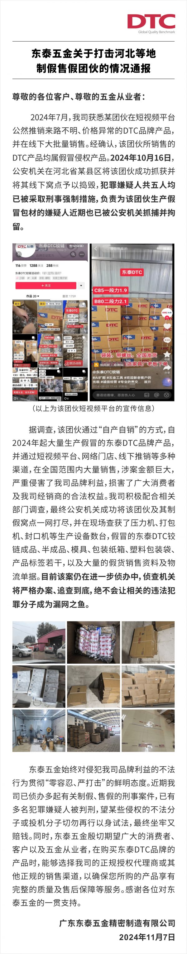 东泰五金发布关于打击河北等地制假售假团伙的情况通报