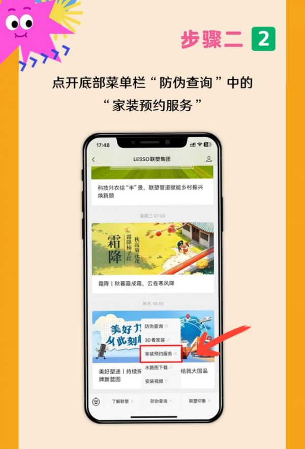 点开底部菜单栏“防伪查询”中的“家装预约服务”