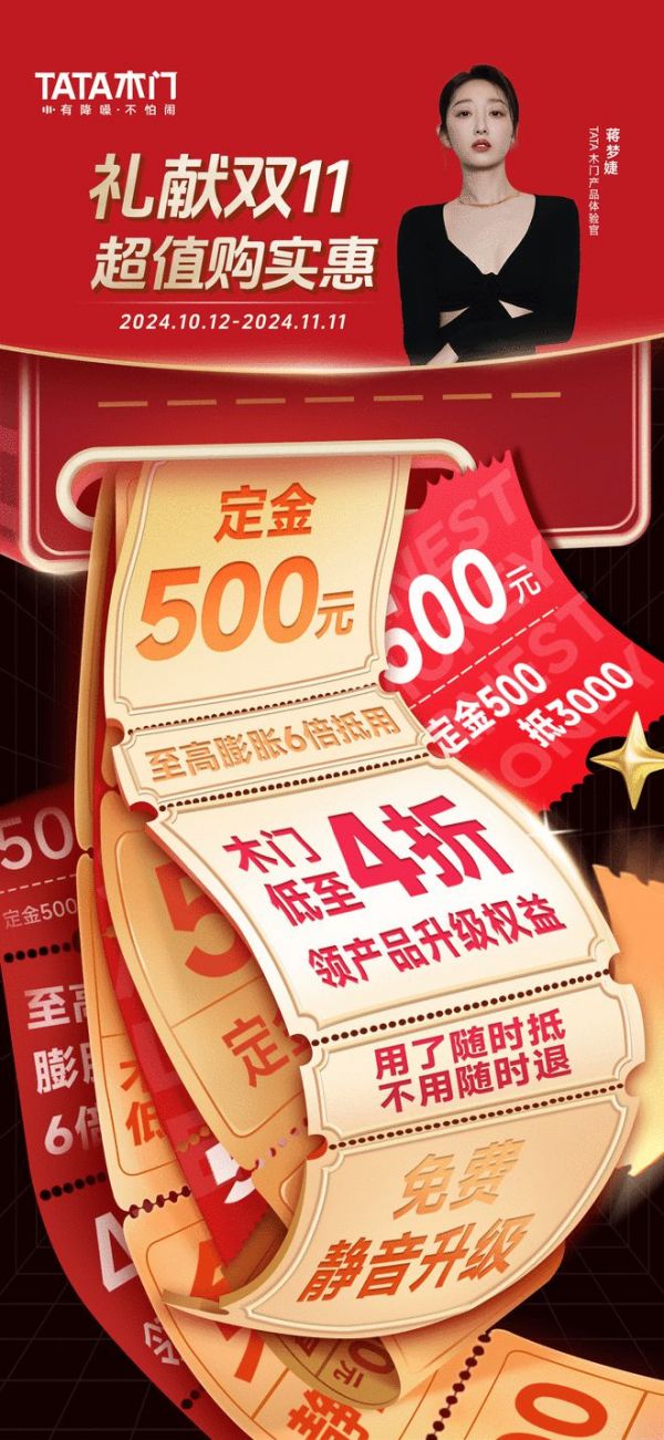 今年的“双11”活动,TATA木门继续延续去年的明星加盟营销策略,但相比较而言,今年的明星阵容更加强大。今年“双11”,TATA木门不仅携手蒋梦婕、袁成杰等多位明星作为产品体验官,还携手自媒体平台顶流大V以及知名家居博主推荐种草,在11月11日当天,蒋梦婕还将与TATA木门总裁携手进行直播助力。