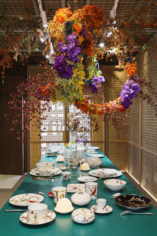 柏图此次呈现经典的“金枝翠雀“系列,携手一流银器品牌昆庭和奢华水晶杯圣路易共同打造精致法式餐桌,并遥“野兽派”以瓷面图案为起点,用新鲜花材打造中式花艺,共同写意一场婉若游龙,引来参观者纷纷驻足、拍照,将中法匠艺带入美学之境。