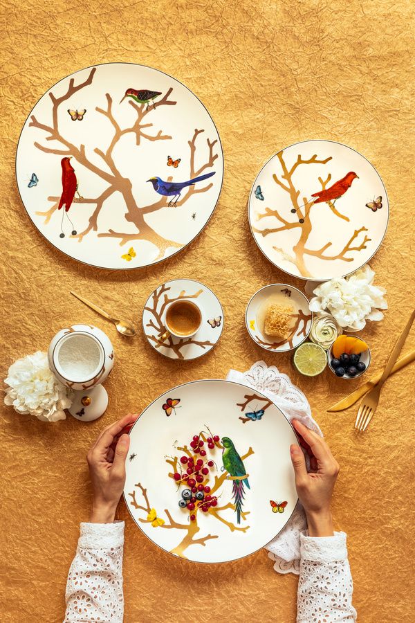 “金枝翠雀“,每一件餐瓷,都在花卉与雀鸟的映衬下灵动再现。以珊瑚树金枝条为背景,雀鸟栖息其上栩栩如生。花枝雀影间,感受古典与自然的共鸣,唤醒餐桌上的诗意时光。
