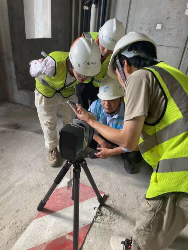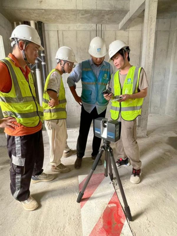在项目实地培训交流现场,中建四局工作人员经过理论培训后对设备操作快速上手,顺利完成了测量。实时在手机端和后台端查阅了现场测量结果并现场进行数据验证。在项目现场培训交流过程中,项目组特别抽取了已拆除铝模支撑,及未拆除铝模支撑的两种环境进行测量验证。保证在拆模前,拆模后,都能进行高效全面的数字实测。提高整改效率及质量。